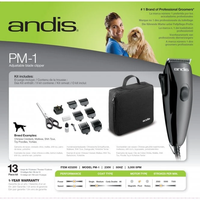 The Andis PM-1 Trimmer is an ultra-quiet cord trimmer ideal for home use. Perfect for trimming around the face, feet and pads, this Andis trimmer offers a thumb-adjustable taper control to alter cutting lengths without changing blades.