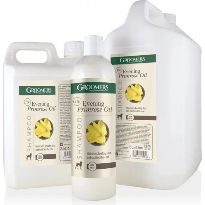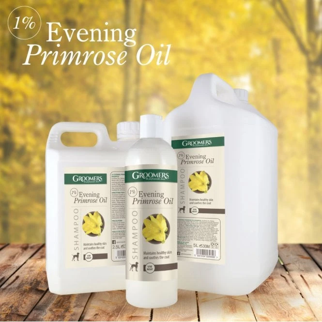 Groomers Evening Primrose Oil dog shampoo is a mild, gentle but effective frequent-use formula suitable for all breeds. The nourishing shampoo helps to improve coat condition, while the 1% pure, cold-pressed evening primrose oil soothes dry, flaky, sensitive skin. This product can be applied neat, with an adequate amount of warm water to disperse the shampoo throughout the coat, but we recommend diluting the product if you are a professional groomer to get the most out of the shampoo. When possible, allow the animal to stand in the product for a couple of minutes for optimum absorption of the essential oils.