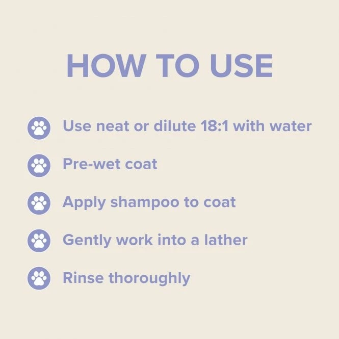 Directions for use: Shake well before use. Wet coat thoroughly with warm water. Shampoo can be used neat or diluted with up to 18 parts warm water in a mixing bottle or jug. Apply shampoo mix from the neck down and massage into the coat using your hands or a rubber mitt from extra cleansing, carefully avoiding the eyes, ears and mouth. Rinse thoroughly with warm water and repeat if necessary. Ensure all shampoo is rinsed from the coat then dry.
